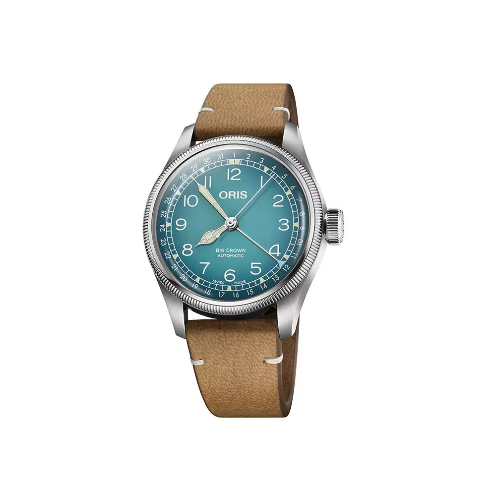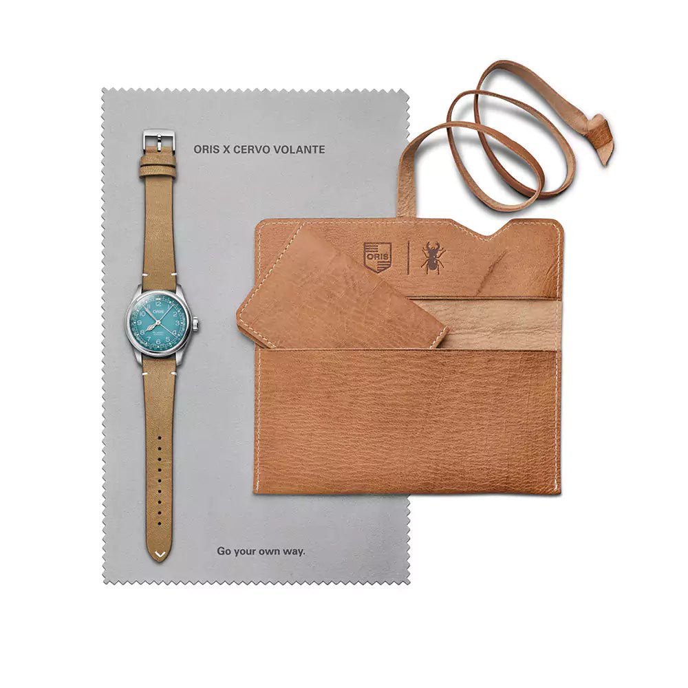 The Oris x Cervo Volante collaboration begins with three Big Crown Pointer Date watches. Each has a gradient dial inspired by Alpine hues and a strap made of sustainable deer leather. They come with a pouch and a card holder made of the same material. But they’re not limited, and nor is this a one-time deal.