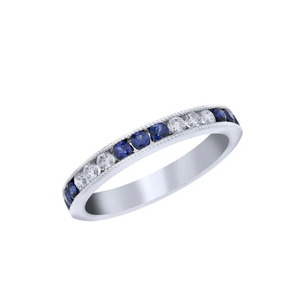 This classic ring showcases alternating diamonds and sapphires in a sleek channel setting, offering a seamless blend of brilliance and vibrant color.