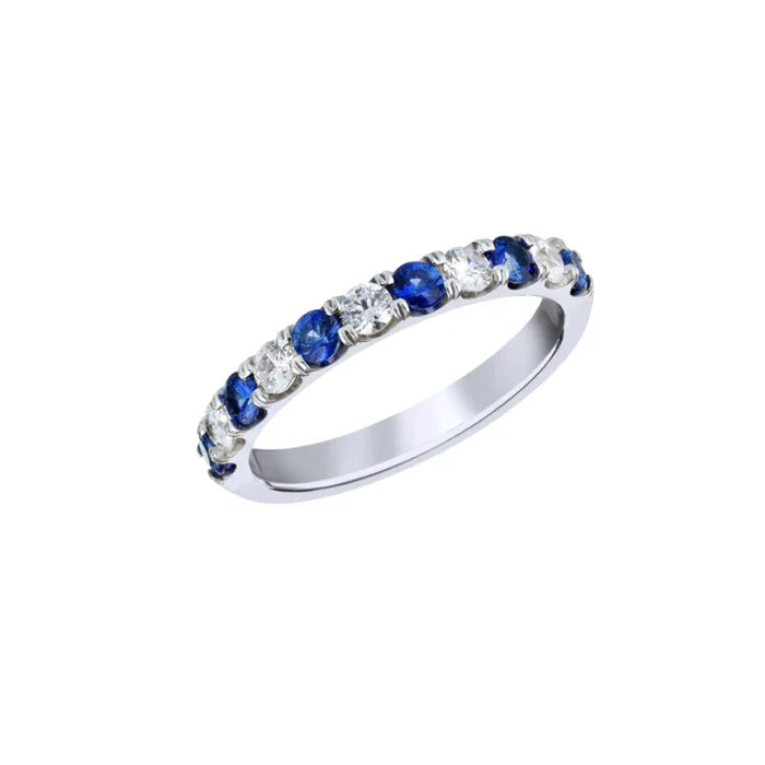 This elegant wedding band showcases a straight row of alternating diamonds and sapphires, beautifully set in a channel setting to create a timeless and sophisticated look.