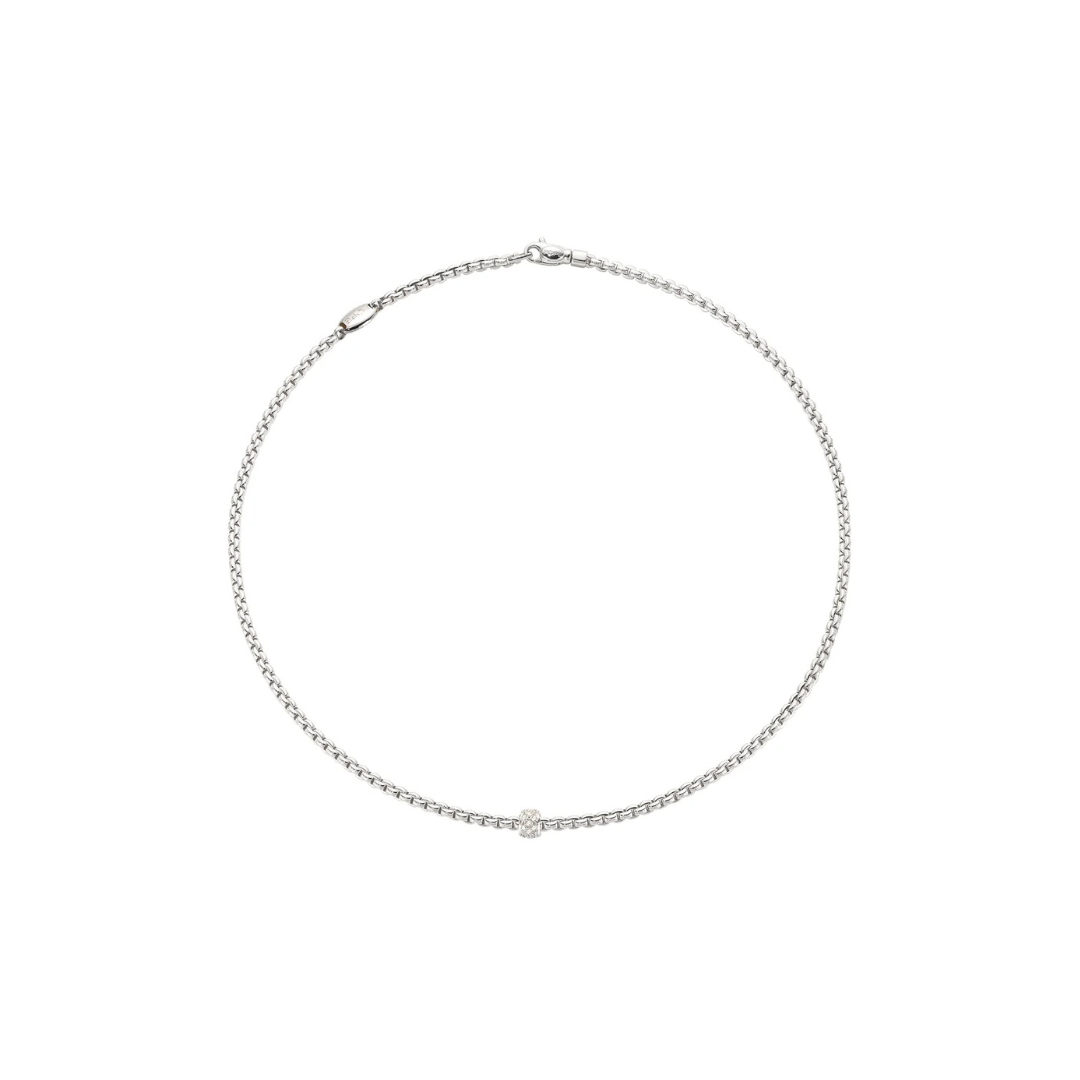 This necklace features a delicate pave set rondel adorned with sparkling diamonds, offering understated elegance.