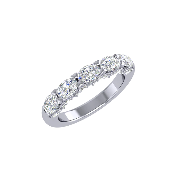 This wedding band features oval diamonds set east to west augmented by inset round diamonds.