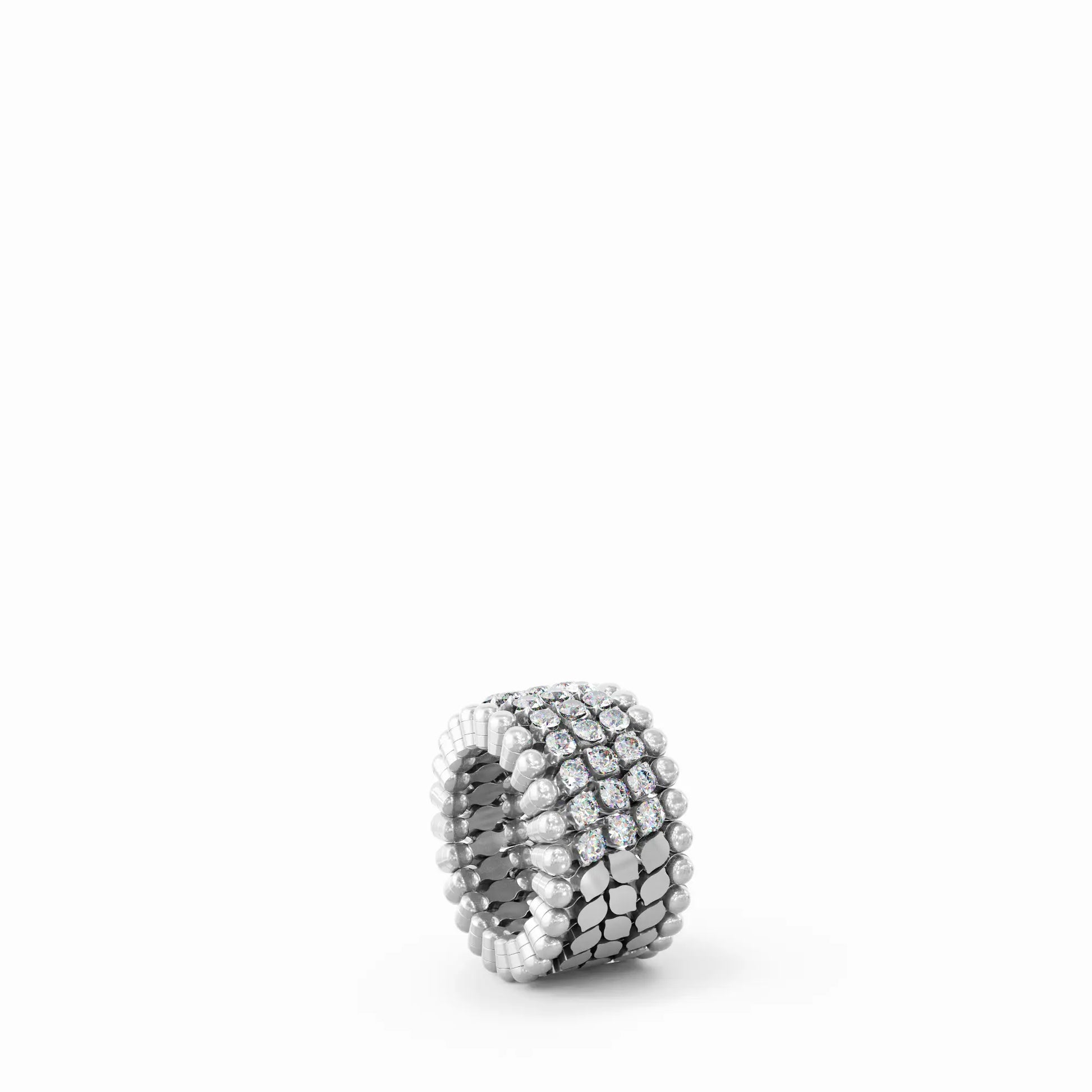 Ingeniously designed, this piece transforms from a sculptural ring into a sleek bracelet with a gentle stretch. Crafted in 18k white gold, it features a refined arrangement of brilliant diamonds that shimmer across the form, whether worn on the hand or wrist. A striking fusion of innovation and elegance—versatile, luxurious, and endlessly captivating.