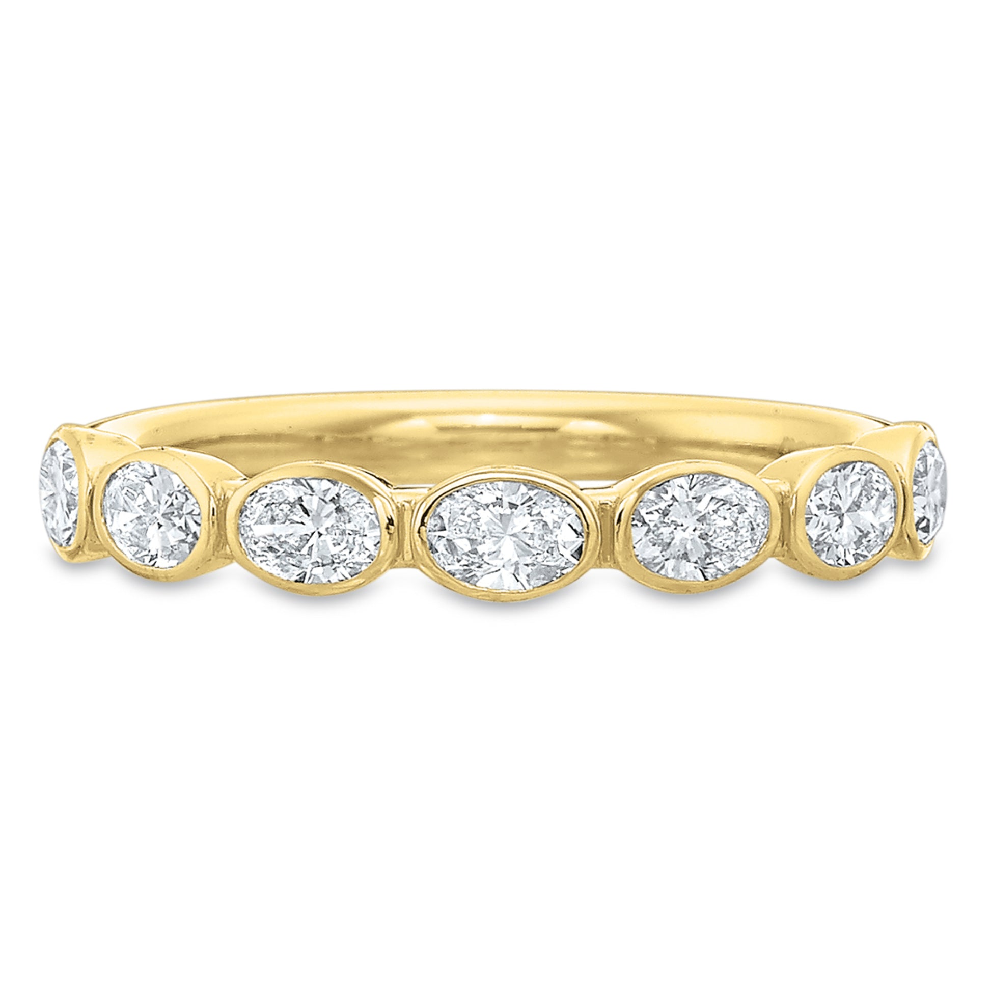 This wedding band showcases east-to-west bezel-set oval cut diamonds, beautifully crafted in warm 18k yellow gold for a modern yet timeless look.