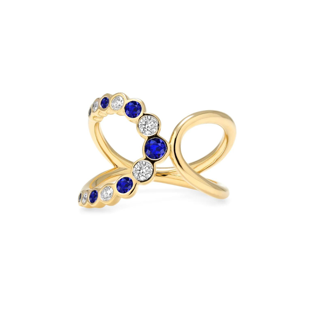 This ring has the perfect combination of vibrant blue sapphires and twinkling diamonds graduating in size and are set in ornate pattern along the larger swirl while a plain gold swirl wraps the finger.
