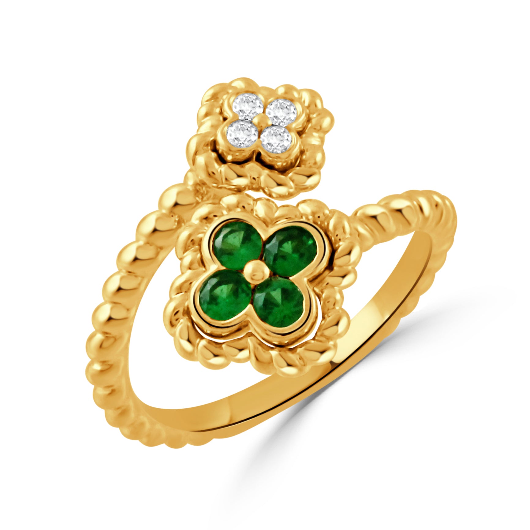 Crafted in 18k yellow gold, this clover bypass ring features sparkling diamonds and vibrant tsavorites, finished with a delicate beaded edge. A graceful design that balances color, texture, and brilliance.
