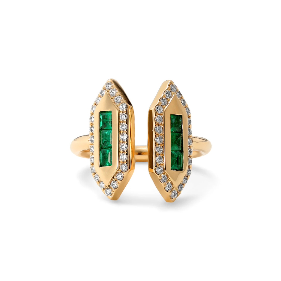 The Pharaoh Ring features a slim, elongated open silhouette crafted in rich gold and adorned with vibrant princess-cut emeralds and radiant round diamonds. Its modern design makes a striking statement when worn solo.
