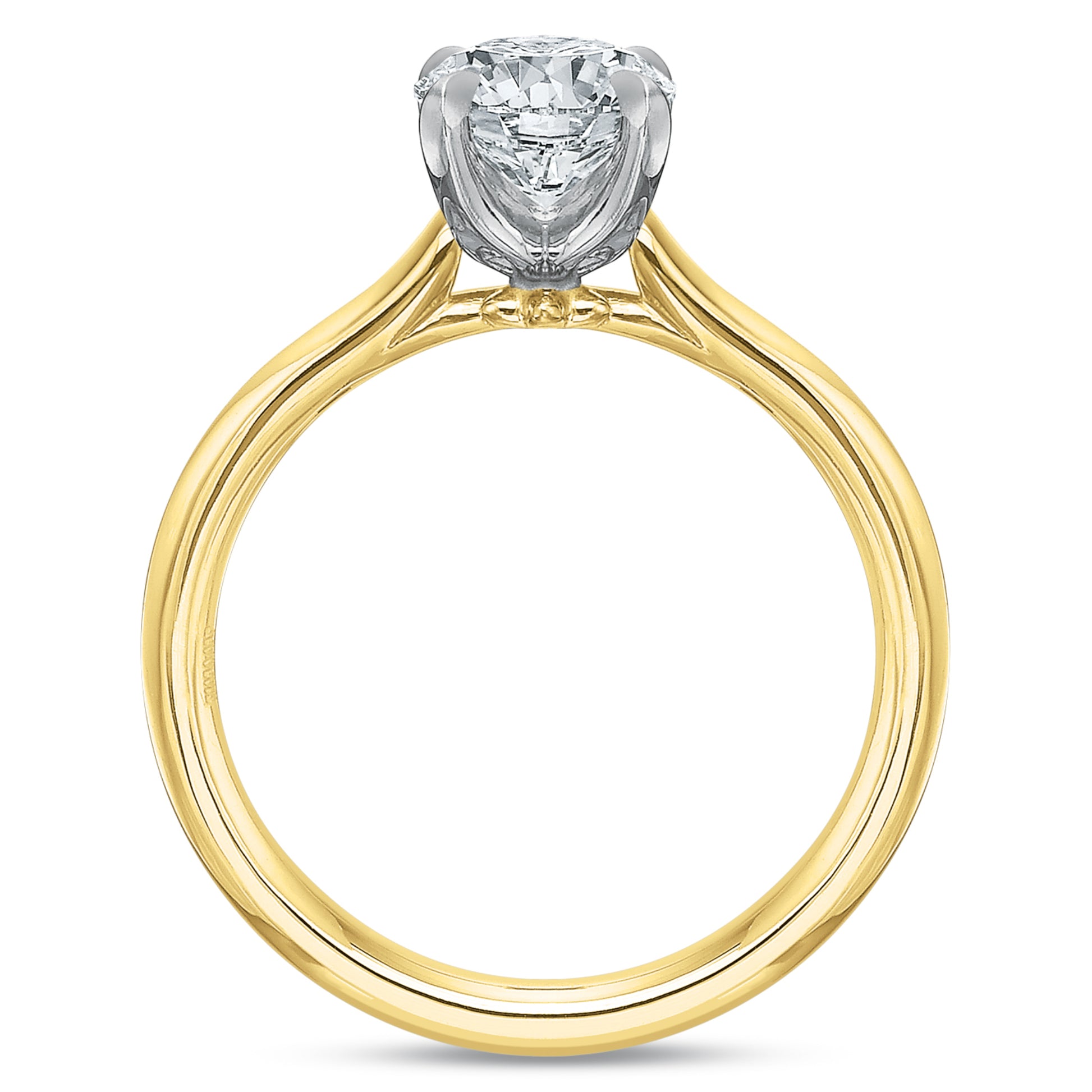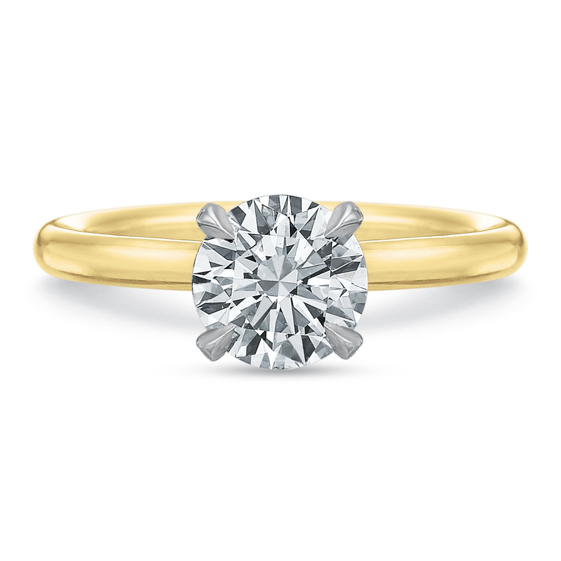 This round engagement ring is crafted with an 18k yellow gold band and finished with a platinum crown for a modern two-tone look.