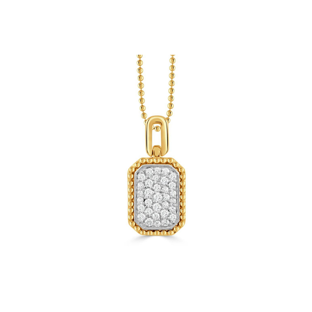 This rectangular pendant features a cluster of sparkling diamonds set in white gold, framed by an 18k yellow gold beaded edge, and gracefully slides onto a matching beaded chain.