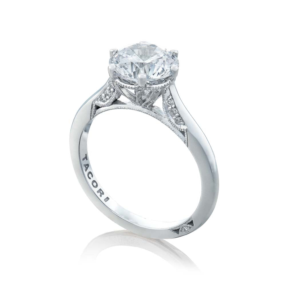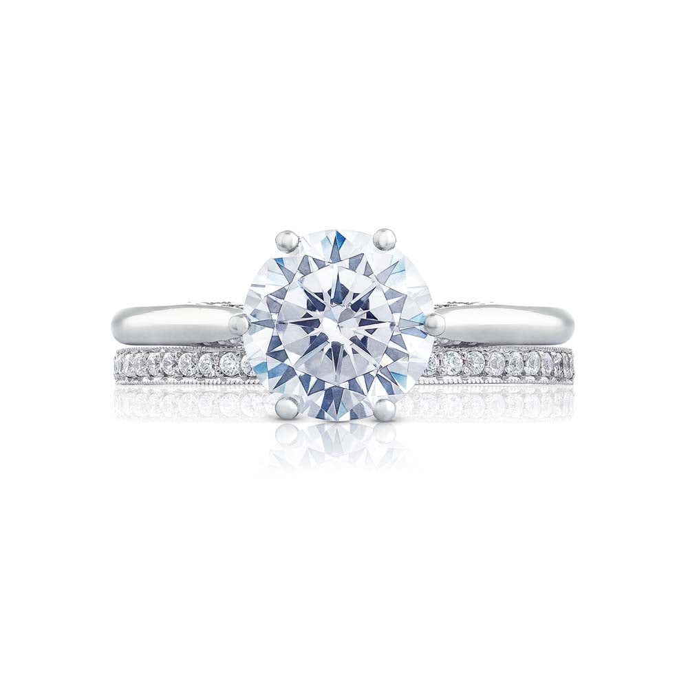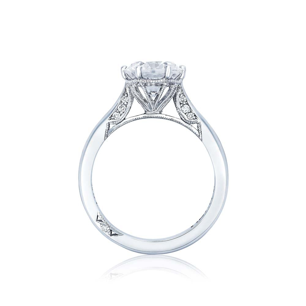 18k white gold six prong solitaire engagement ring featuring the Simply Tacori crescent fabric to add a hidden diamond detail on the innerface of the ring.