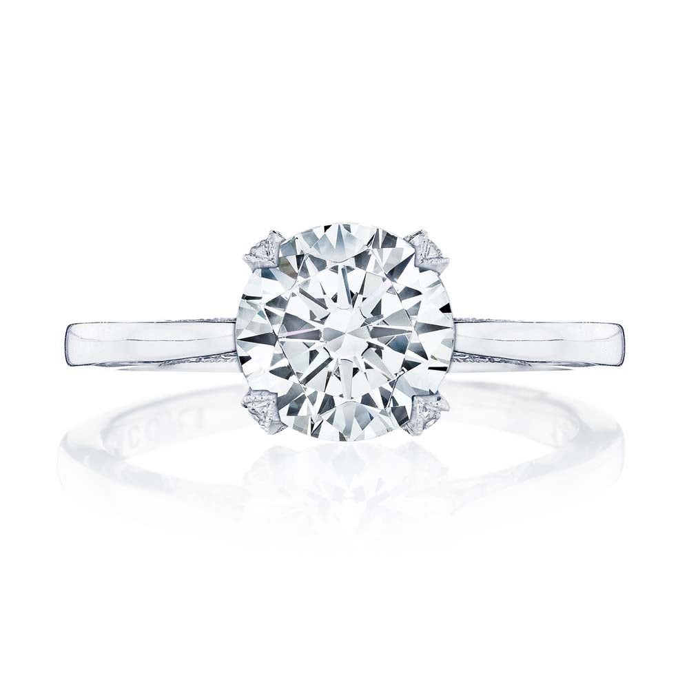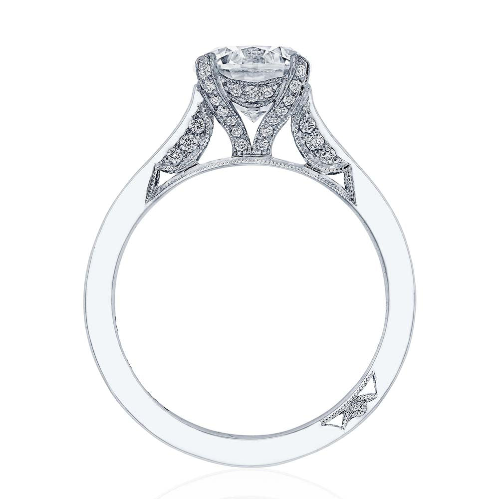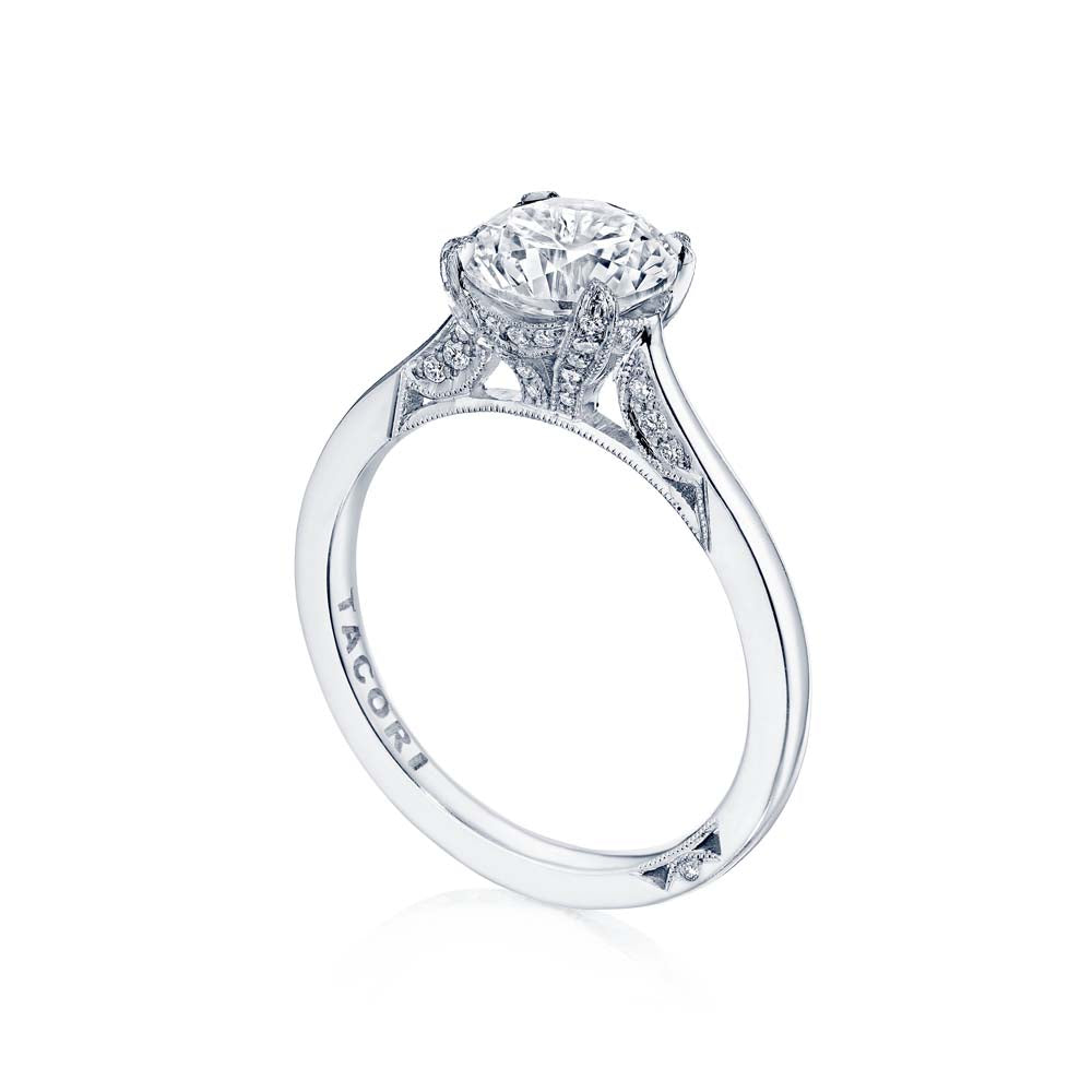 18k white gold solitaire engagement ring featuring a diamond-studded Simply Tacori crescent fabric. The cathedral foundation boasts mor round brilliant diamonds and a hidden bloom.