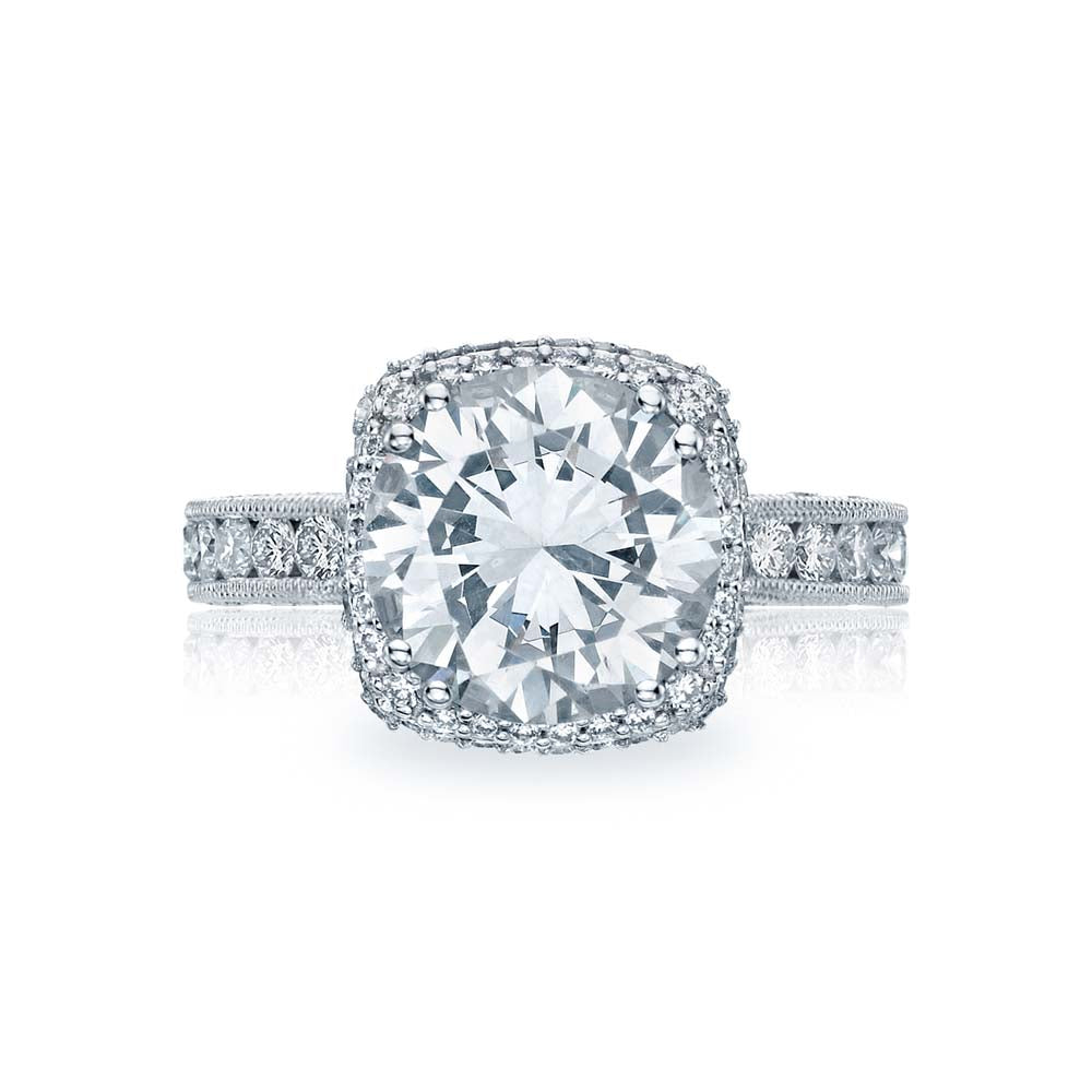 Platinum cushion shape diamond bloom engagement ring featuring channel set diamonds set three quarters of the way down the ring's foundation.