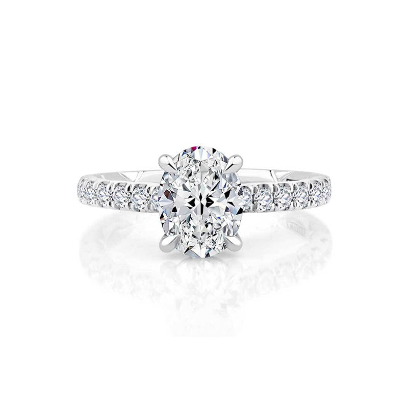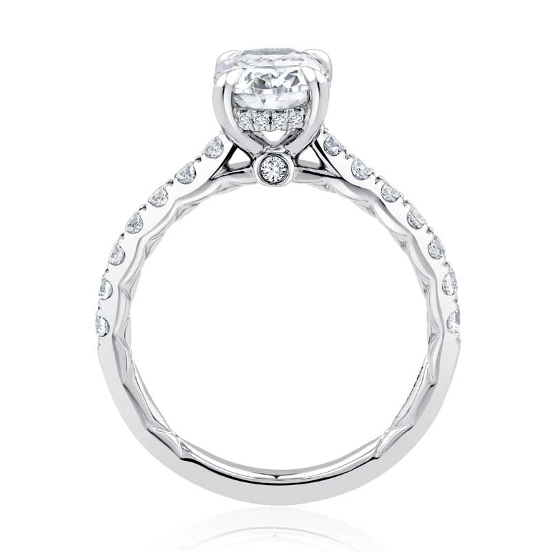 This four prong engagement ring, showcasing an oval center stone, features a diamond band, diamond accent gallery, and the iconic A.JAFFE quilted shank.