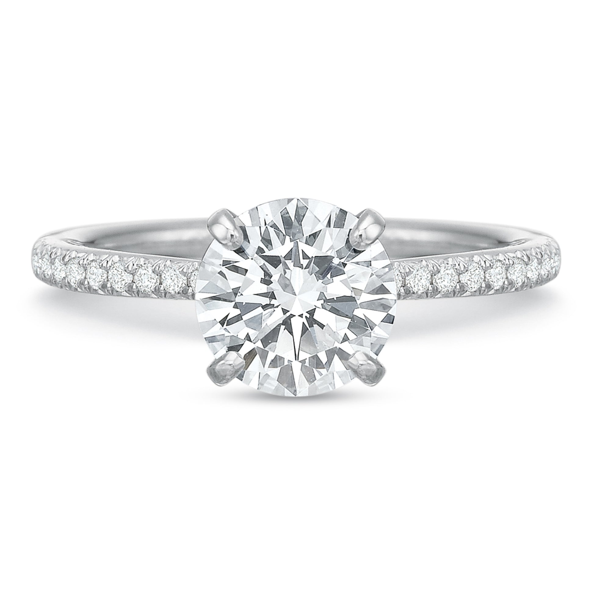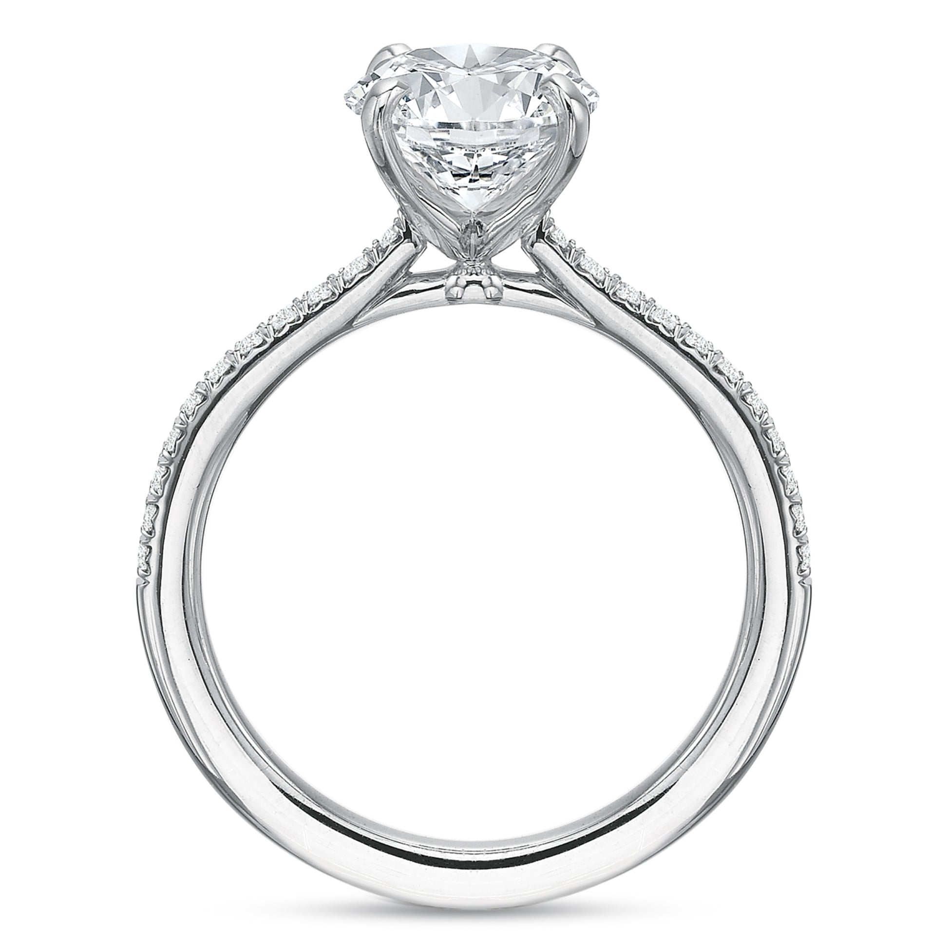 This Platinum solitaire engagement ring features diamonds on the foundation.