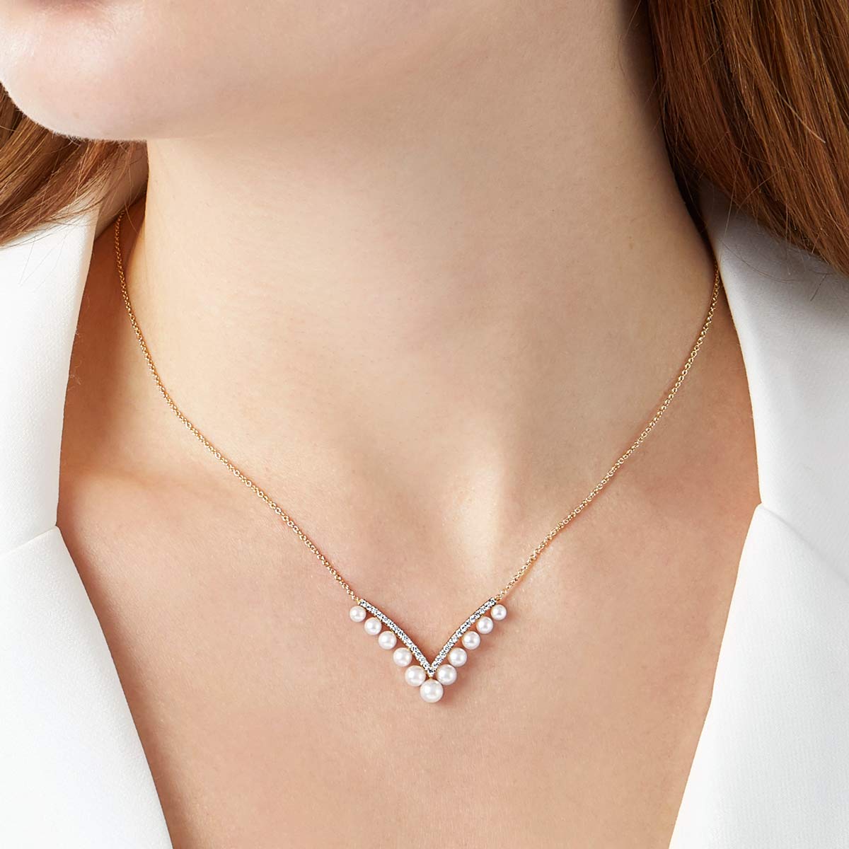 This 18k gold necklace features 3-5mm White Japanese Akoya pearls set beneath a diamond curve
