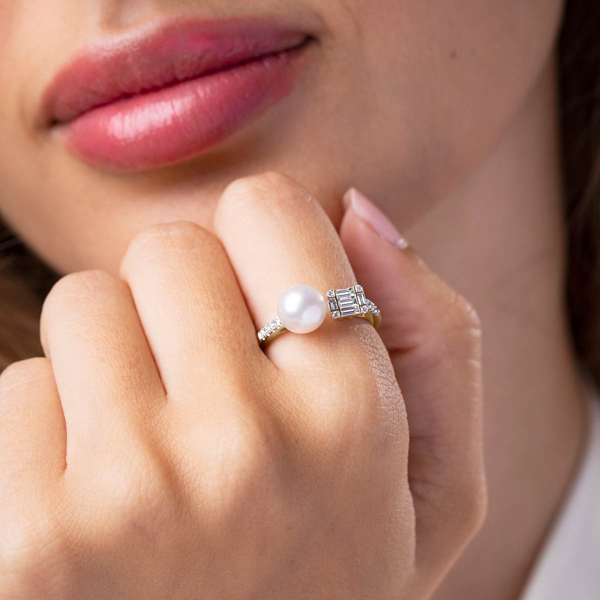 This 18k gold ring features a 7.5-8mm White Japanese Akoya pearl offset by diamonds