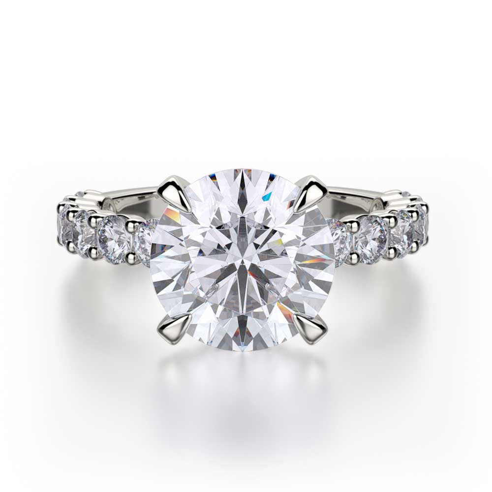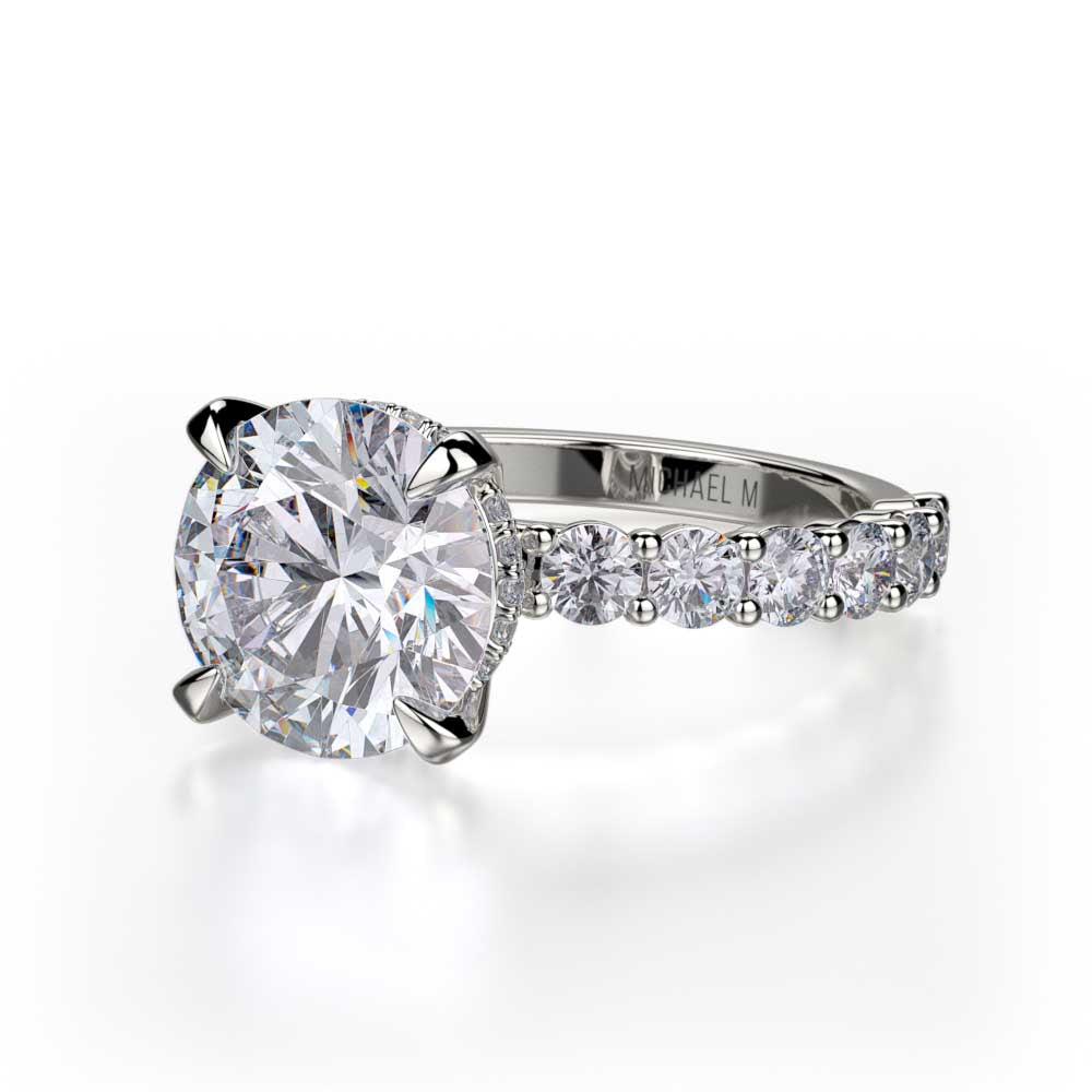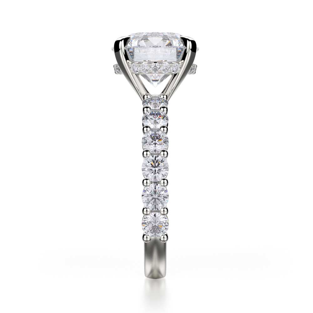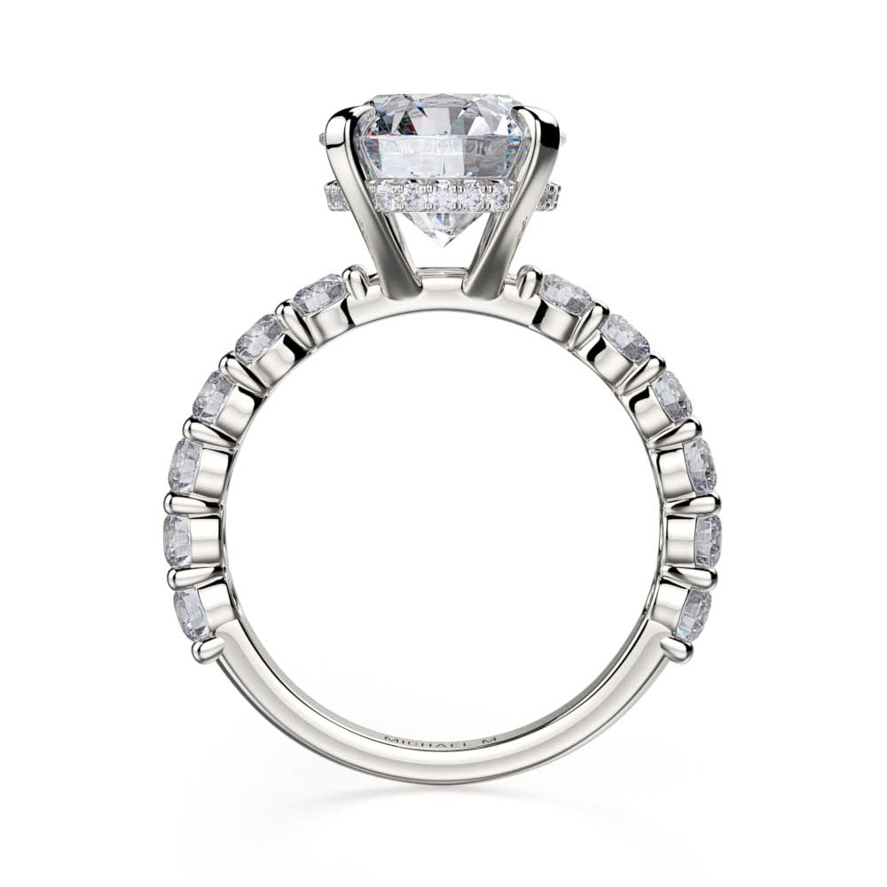 18k white gold shared prong diamond engagement ring set 3/4 way around featuring a diamond hidden halo beneath the round center stone