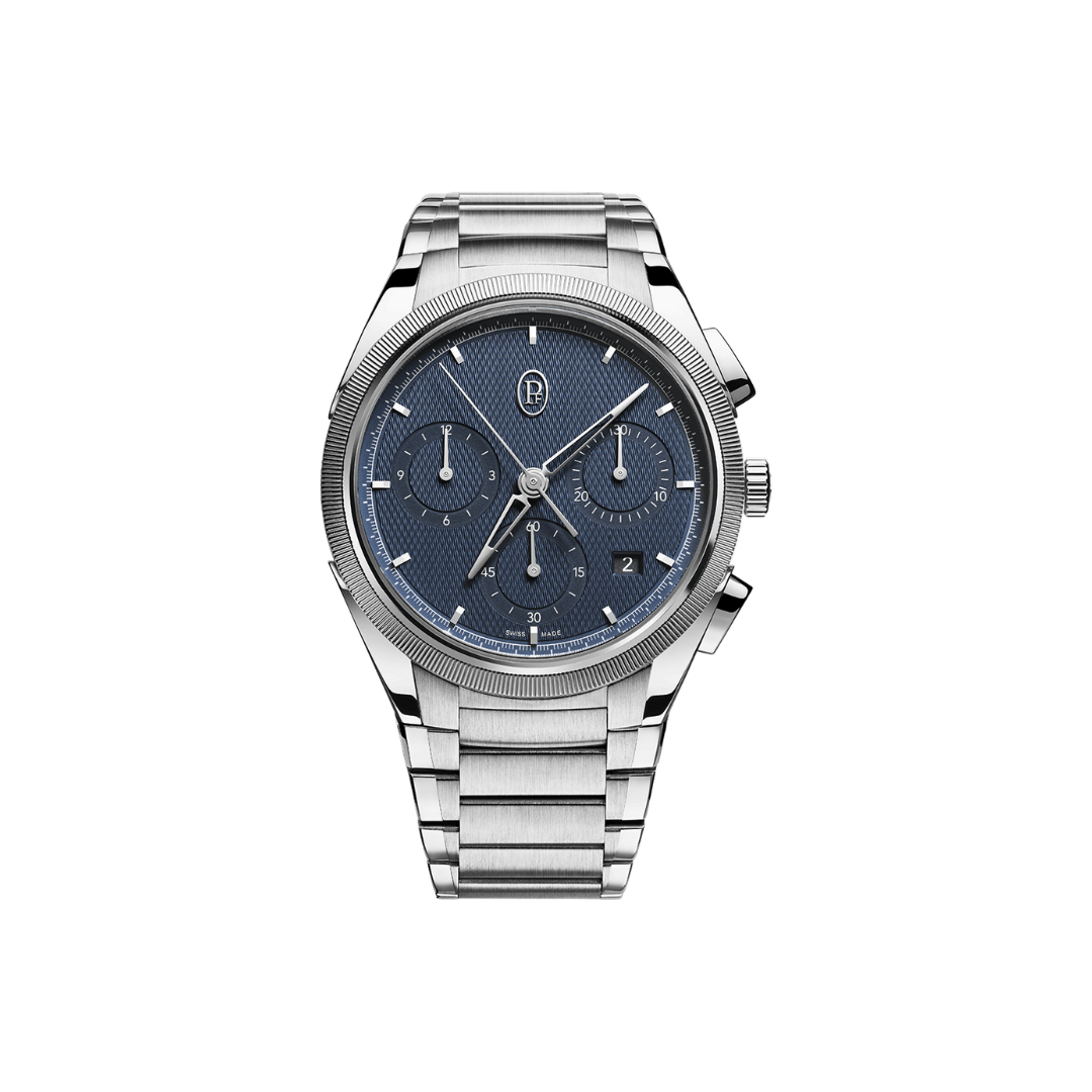 At 42 mm, the TONDA PF Chronograph is a perfect example of how a very special design can be adapted to the requirements of a complication. The virtually smooth surface contrasts with the finely sand-blasted minute track and the counters which are encircled in a slightly darker blue.